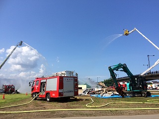 消防による消火訓練もはしご車やヘリなども出動して見ごたえのある訓練でした。